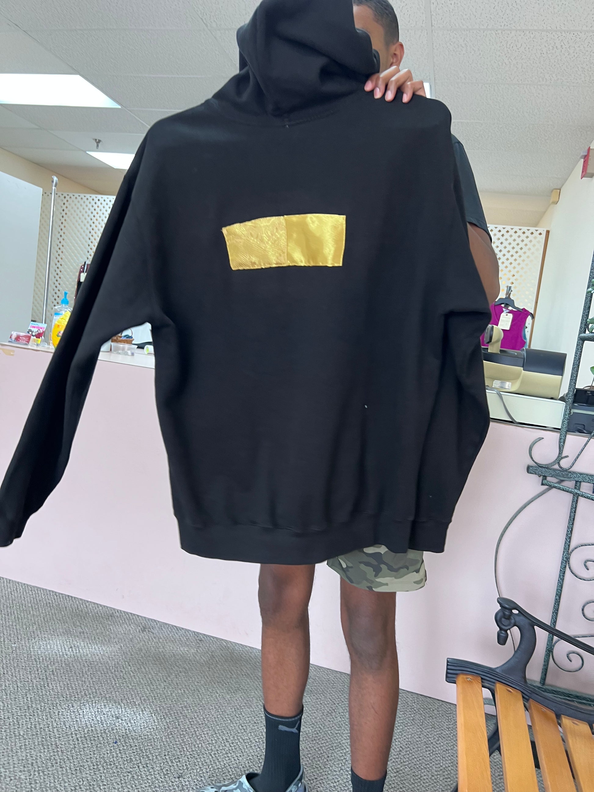 1/1. wearable art piece made with genuine Cloth of Gold and gold thread, may 21 2023. made with defective hoodie sample, logo patches from thrifted secondhand shirt, and genuine goldwork cloth and thread.