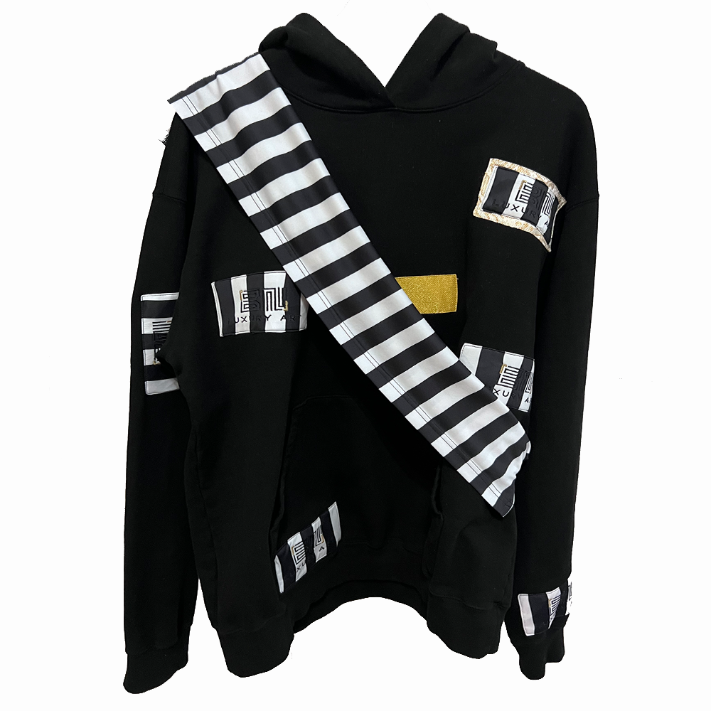 My first go at a conceptual wearable-art streetwear piece, from when I started out in my sophomore year of high school. The idea was to make a piece that communicated the same ideals and values that my brand would embody in practice. One of the hoodie samples that ordered from my manufacturer at the time turned out to be defective. Sending it back to be discarded was out of the question for me, naturally, so I decided to make something valuable and unique out of it. In this I was inspired by the Japanese art of Kintsugi, in which broken pottery is repaired with golden lacquer to show that repair is a part of the history of an object to be celebrated, and the practice of patchwork mending in general. For this project, I used a mix of high and low materials - I sourced genuine, beautifully designed Cloth of Gold fabric from a historical vestment manufacturer in Europe that worked with clergy and royalty and woven metallic goldwork thread, and put those patches throughout the design and where the imperfection was, and an old referee shirt that I got from a thrift store, that reminded me of prison bars, which I had cut up and patched with my logo, and draped and torn across the shoulder of the hoodie. The hoodie itself is a heavyweight cotton French Terry hoodie, the first prototype of our heavyweight hoodie before I switched to our current model with higher quality fabric, organic cotton, and a less opaque supply chain, which I would learn is common when dealing with suppliers at that level.